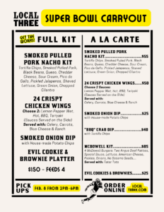 Pick up on Super Bowl Sunday, February 8 from 2-6pm.